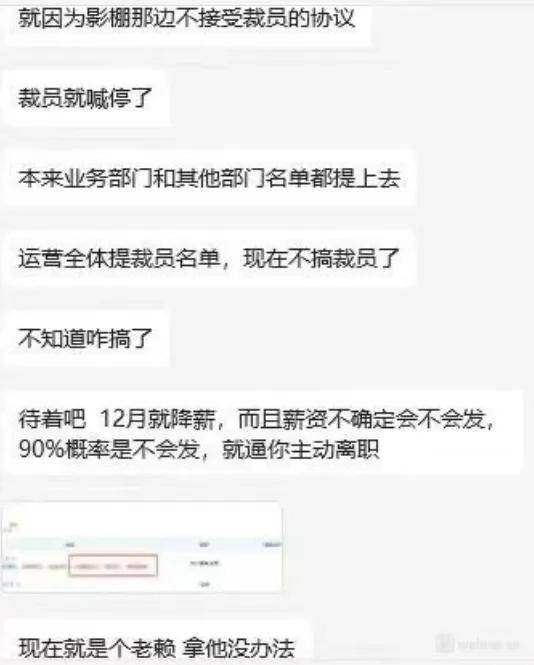 據爆料的信息還顯示,讓打工人不知所措的是,因為一些部門對裁員協議不滿,拒籤後目前裁員也被喊停了,**也就是現在不搞裁員了,想待就待着吧,**12月就降薪,關鍵是薪資還不確定會發,90%的概率是不會發。