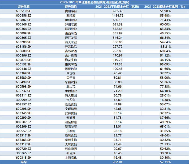 2021至2023年間,消費ETF(159928)標的指數僅1只成分股未曾分紅!共有34只成分股連續3年分紅,數量佔比高達81%。在34只連續3年分紅的成分股中,貴州茅台以超3285億元的年均現金分紅位列第一,其次是五糧液和伊利股份。