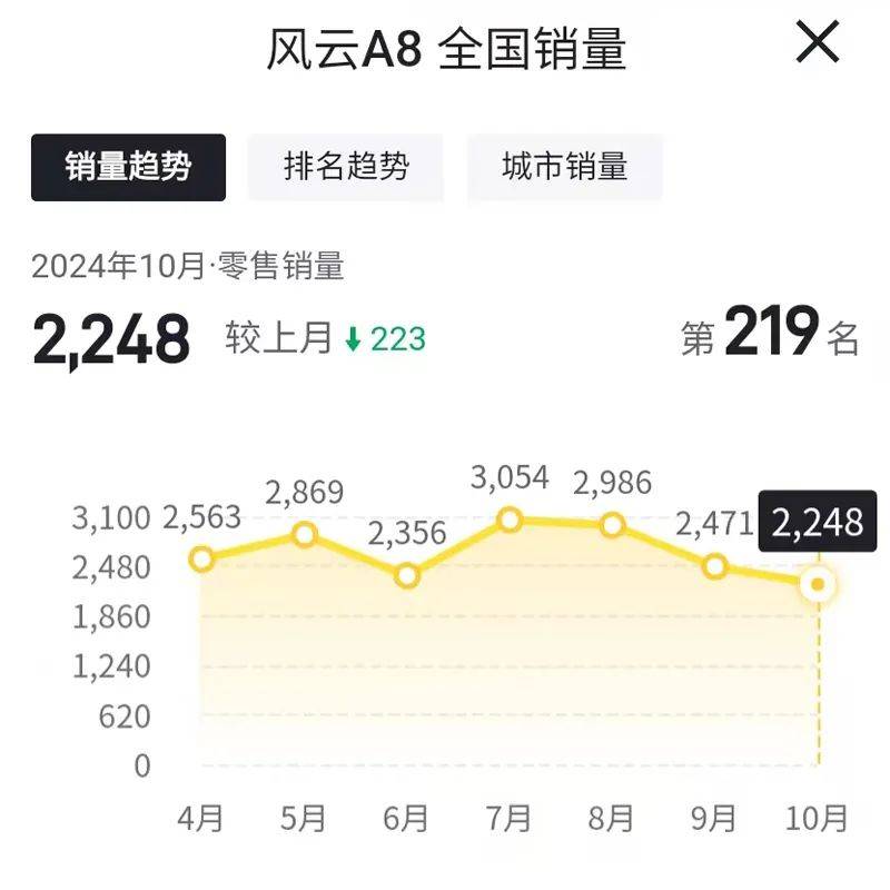 從最新的銷售數據來看,奇瑞風雲A8的銷量表現確實令人擔憂。從今年7月份開始,這款車的銷量就一直徘徊在3000輛以下,與奇瑞汽車旗下的其他車型相比,這樣的銷量成績顯然是非常低迷的。而更令人沮喪的是,從今年8月份開始,奇瑞風雲A8的銷量已經連續三個月出現不同程度的環比下滑。這種持續下滑的趨勢,無疑給奇瑞汽車帶來了巨大的市場壓力。