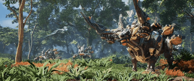 而科技感十足的機械獸穿行在這樣的場景間,鋪開了一個自然與近未來科技交織的世界。