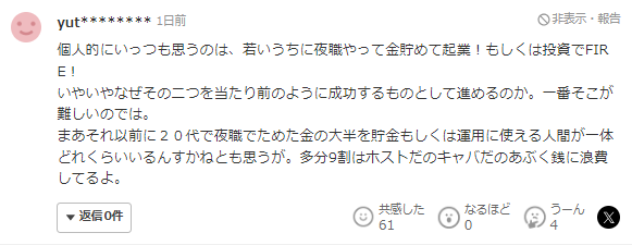 就我個人而言,我一直認為:趁年輕,先做一份夜晚工作,攢錢後自己創業!或者通過投資來退休!但現實則狠狠打臉,為什麼我們要把這兩件事作為成功的不二法門呢?這才是最難的部分,不是嗎?要知道,在此之前,有多少20多歲的人能把晚上工作攢下的錢大部分存起來或投資呢?大概率90%的人都把錢浪費在了陪酒女或是牛郎和其他無效消費上了。