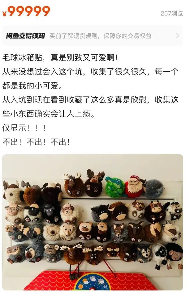 他們會將自己的戰利品掛在閒魚上展示,標價9999999元是冰箱貼的防拍價,文案裏還會滿是歎號的寫上“不出”。