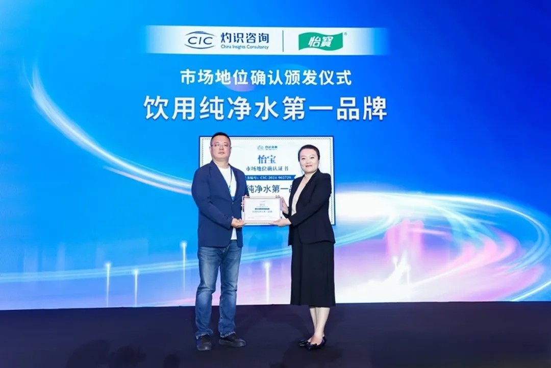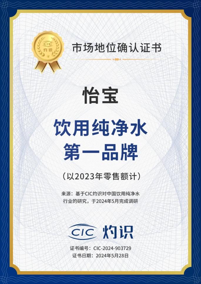 2024年5月,華潤怡寶獲得由知名權威諮詢機構CIC灼識諮詢授予的“飲用純淨水第一品牌”市場地位確認證書!