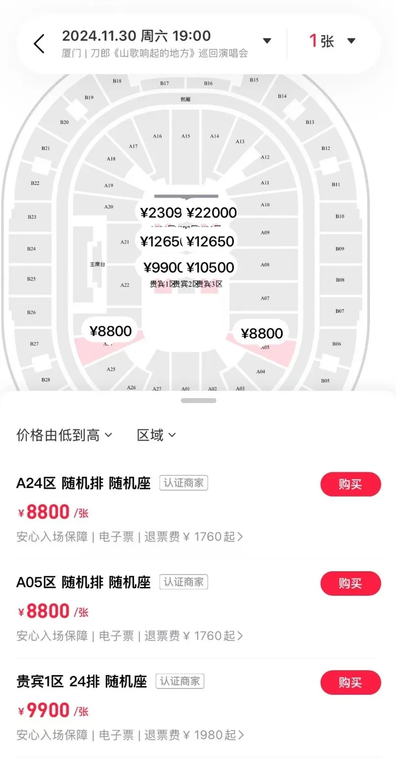 在二級票務市場中,1280元的內場票被炒至22000元。