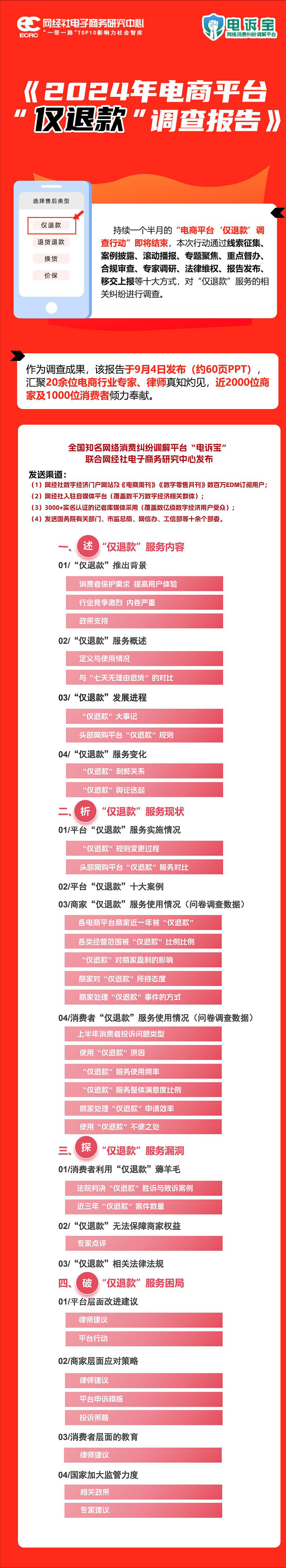7月23日,網絡消費糾紛調解平台“電訴寶”聯合網經社電子商務研究中心發起國內首個“電商平台‘僅退款’調查行動”。在近一個半月的調查中,上線了國內首個電商商家“僅退款”第三方投訴通道,最終於9月4日發佈國內首份《2024年電商平台“僅退款”調查報告》。如今,“僅退款”調查行動告一段落,但對電商行業的消費亂象的追蹤卻未停步。