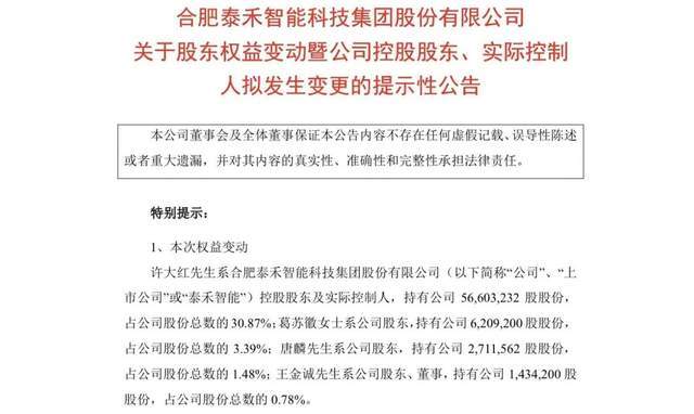根據公告,此次陽光新能源持有的泰禾智能10.24%的股權,擁有的表決權為13.36%。因泰禾智能實控人,放棄餘下所持股份表決權,而按照股權轉讓協議完成公司董事會的改組後,新的控股股東將成為陽光新能源,而泰禾智能的實控人也將變成安徽首富曹仁賢。