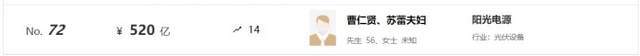 曹仁華目前持有陽光電源30.5%的股份。根據最新《胡潤百富榜》,曹仁華、蘇蕾夫婦位於第72位,身家520億元。