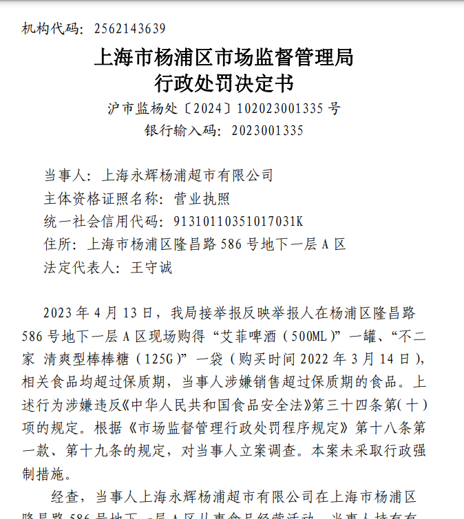 今年2月份,上海市場監管部門對楊浦永輝超市有限公司銷售超過保質期的食品一事進行了查處和處罰。