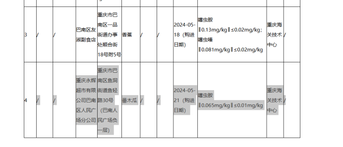 重慶市巴南區市場監督管理局發佈關於4批次食品不合格情況的通報(2024年第15號),其中重慶永輝超市有限公司巴南區人民廣場分公司抽檢的番木瓜被檢出噻蟲胺超標6倍等等。