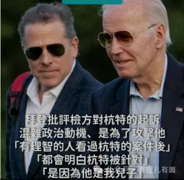 拜登的藉口是,亨特被指控只是因為他是我(民主黨籍美國總統)的兒子,他們(共和黨)想通過打擊亨特進而打敗我,(目前來看)他們不會罷休。