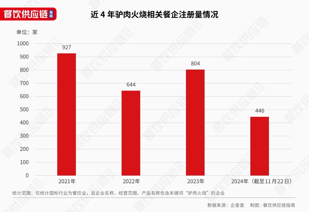 企查查數據顯示,2019年,全國驢肉火燒相關餐企的註冊量為1400多家。而後幾年,註冊量再未破千。截至11月22日,今年驢肉火燒相關餐企的新註冊量甚至不足500家,僅為5年前的三成左右。現有的驢肉火燒相關餐企存量也在不斷減少。