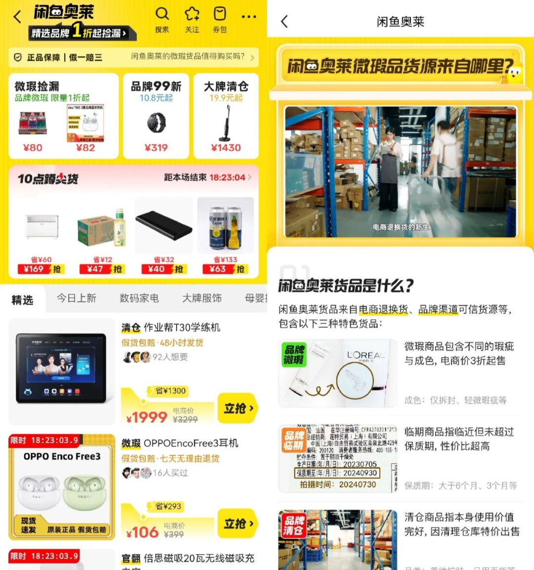 它不久前上線了“閒魚奧萊”頻道,放在了“推薦”頁面欄目第一的位置,點進去看起來像是在對標“百億補貼”。