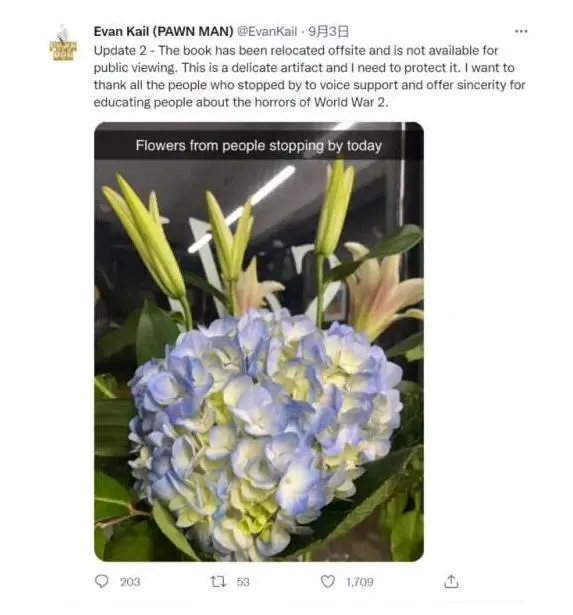 好在,從支持者那裏,凱爾收穫了力量。發佈視頻後,埃文稱自己多次被留言感動得落淚,有人來店裏和他交流,還有人向其送花致謝。其中,有不少中國網友,紛紛留言表示,“你在保護我們的歷史”“中國人會永遠記住這樣的情誼”……