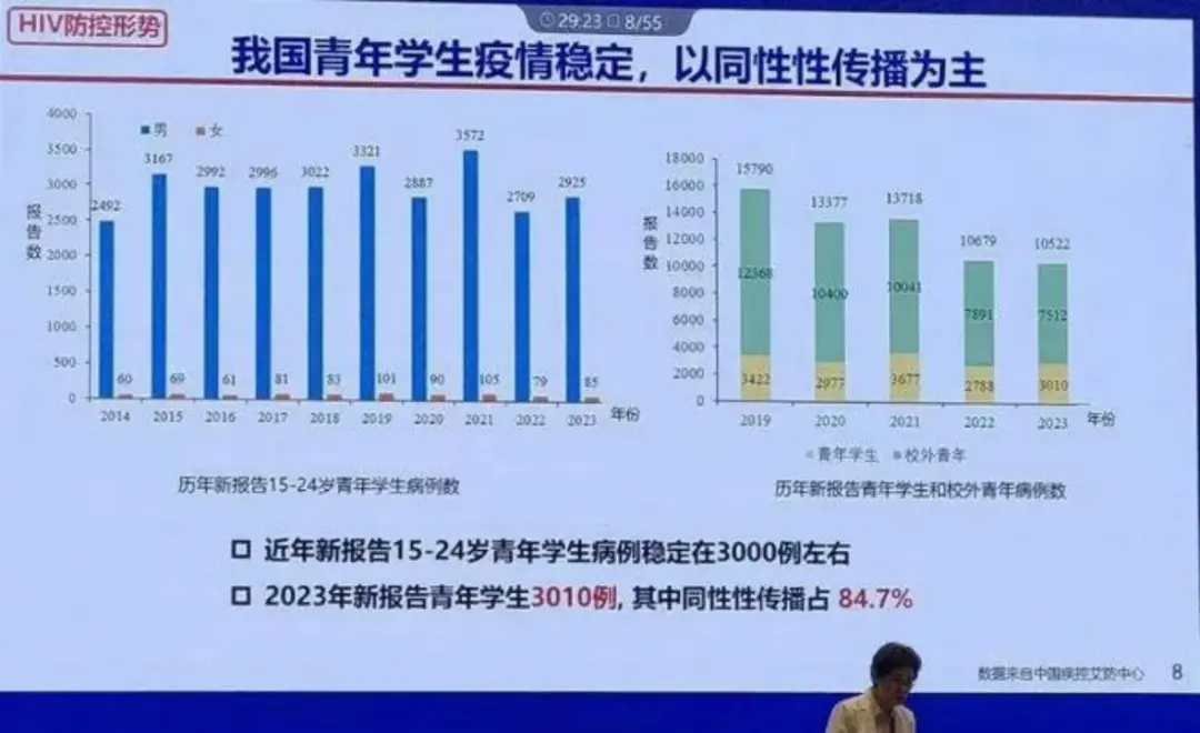 而據相關數據,2020年至2023年,新報告青年學生病例分別為:2977人、3677人、2733人、3010人,四年間共報告12397人。2010年至2023年間,報告青年學生感染病例已達35704人。