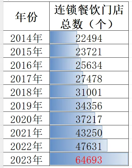 所以,全國各大連鎖餐飲的門店數才能從2014年的2萬多家,上漲到2023年的6萬多家,幾乎漲了三倍
