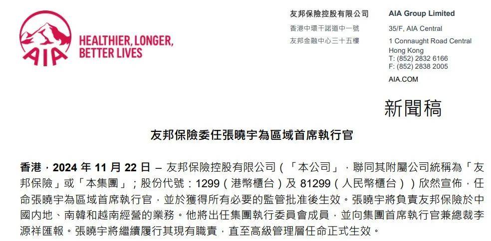 友邦表示,張曉宇將繼續履行其現有職責,直至高級管理層任命正式生效。