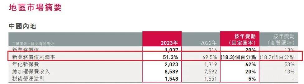 但根據2023年母公司友邦保險年報顯示,友邦保險中國內地的新業務價值率51.3%,較上年同期的69.5%,下滑18.2%。