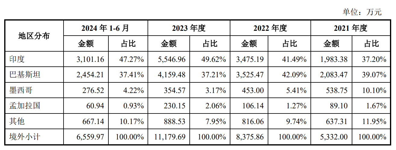 藍宇股份的海外業務快速膨脹。從2020年的5332萬元,增長到2023年的1.1億元,佔比從22%增加到32%。今年上半年,海外業務營收佔比繼續超過3成。增長較快的市場主要是印度和巴基斯坦,這兩個市場在去年貢獻了將近1億元營收。