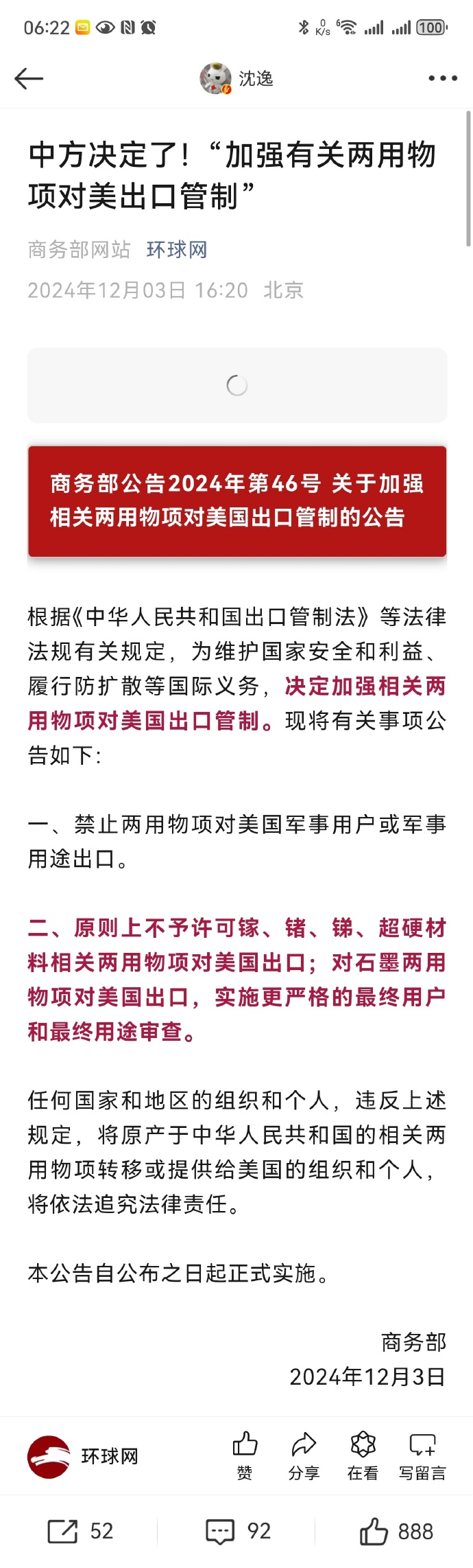 把輸台灣的棉花都禁了,台灣別説炮彈,連子彈都做不出來。這麼一個小島,這麼一羣素質低的人,還想對抗中華民族?