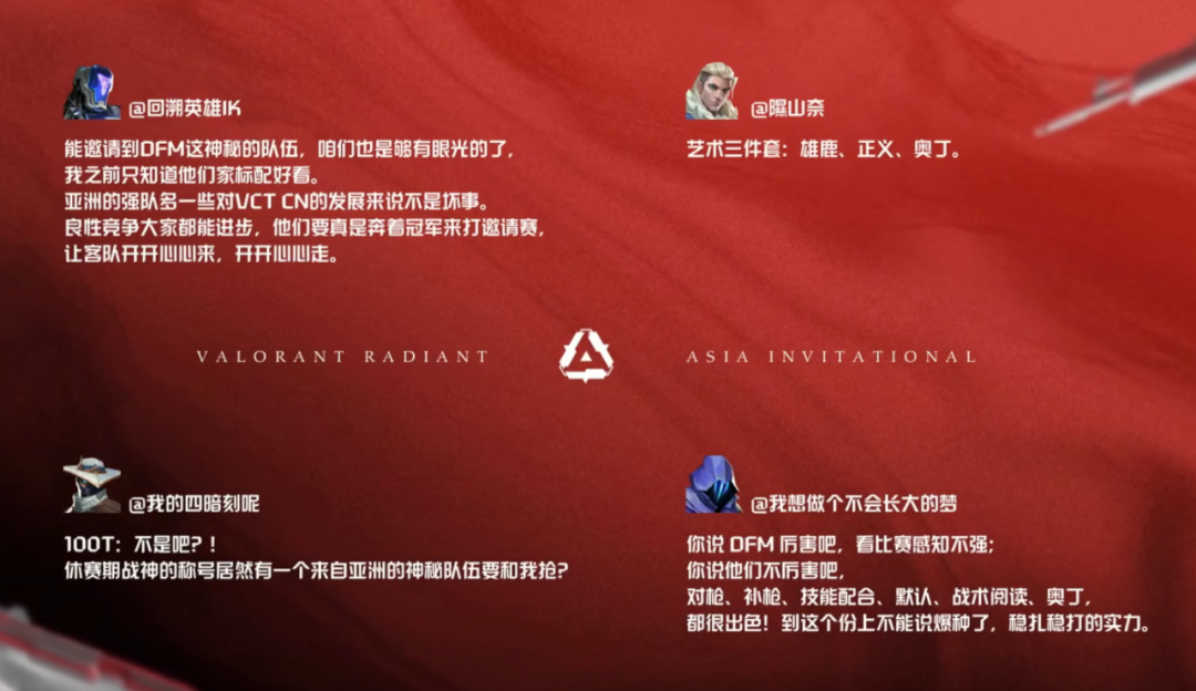 本次邀請賽FMVP、PRX選手f0rsakeN,在賽前採訪中指出,這次比賽的四強隊伍分別來自不同的國家——中國(TE)、韓國(DRX)、日本(DFM)、新加坡(PRX)。“我認為我們亞洲的無畏契約實力一起在進步。”