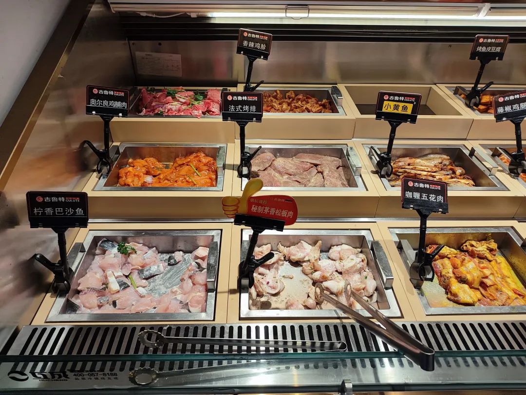 在古魯特廣州首店,紅餐網實地探訪後也發現,該店肉類食材有20-30種,大部分也都是豬肉或雞肉,牛肉只有2-3款。且其中一款牛肉是盤裝的形式,每盤大約2片,顧客雖然可以無限量拿取,但門店補貨的速度並不快,基本剛上新就會被拿空。