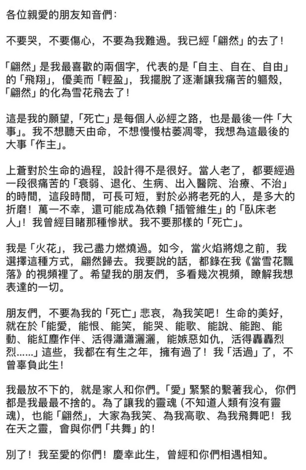 她的遺書和公佈方式簡直浪漫又自由,彷彿是小燕子和紫薇一起送走香妃後,在御花園裏奔跑着大喊“不好了,香妃娘娘變成蝴蝶飛走了”,給人一種荒誕卻又合理的不真實感。