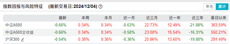 中證A500、中證A500全收益、滬深300指數累計漲跌幅