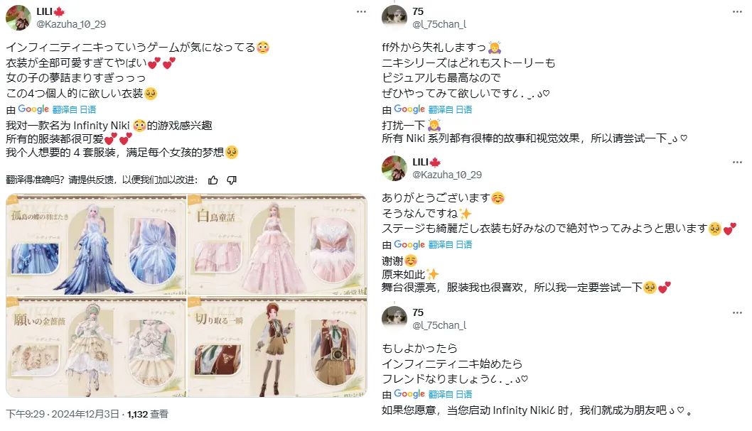 12月3日開啓預下載後,遊戲登頂AppStore全球34地區免費榜,同時日服名稱“インフィニティニキ(Infinity Nikki)”登上推特熱搜,從當天一些動態和評論中,也很容易感受到外服玩家不輸國內玩家的熱情:
