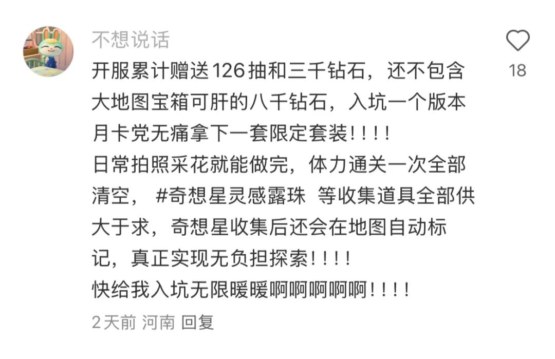 社交媒體上很多玩家安利的心情與我相似。“開服累計贈送126抽和三千鑽石,大地圖寶箱可肝八千鑽石,入坑無痛拿下限定套裝……大家快玩無限暖暖啊”——這段定型文在玩家社區傳播了一週後,《無限暖暖》終於在今天如約迎來開服。