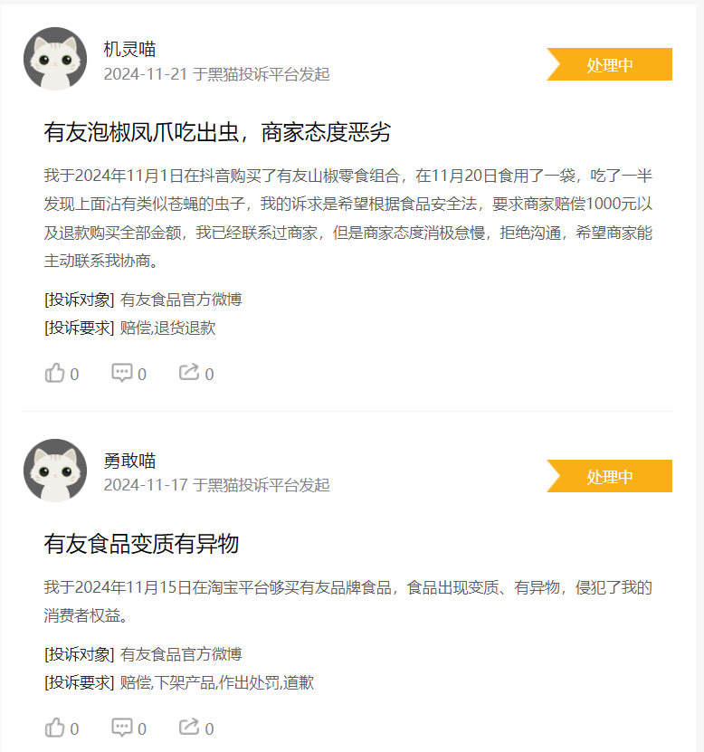 例如,黑貓投訴的最新投訴內容顯示,不少消費者投訴有友泡椒鳳爪等產品吃出蟲子甚至食品變質,而且商家態度十分惡劣。