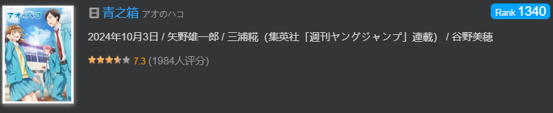 根據《JUMP》順位排名數據,全本刊載二十多部作品,《青之箱》長期位於中上游,2023年全年平均在第5位左右。受網絡平台宣發加持,《青之箱》漫畫單行本首卷銷量近20萬冊,動畫化前發售的6卷單行本總銷量130萬冊,動畫開播前單行本總銷量達500萬冊。無論是讀者人氣還是商業成績,該作較於《五等分花嫁》《我們無法一起學習》等以往戀愛題材人氣作品不遑多讓。