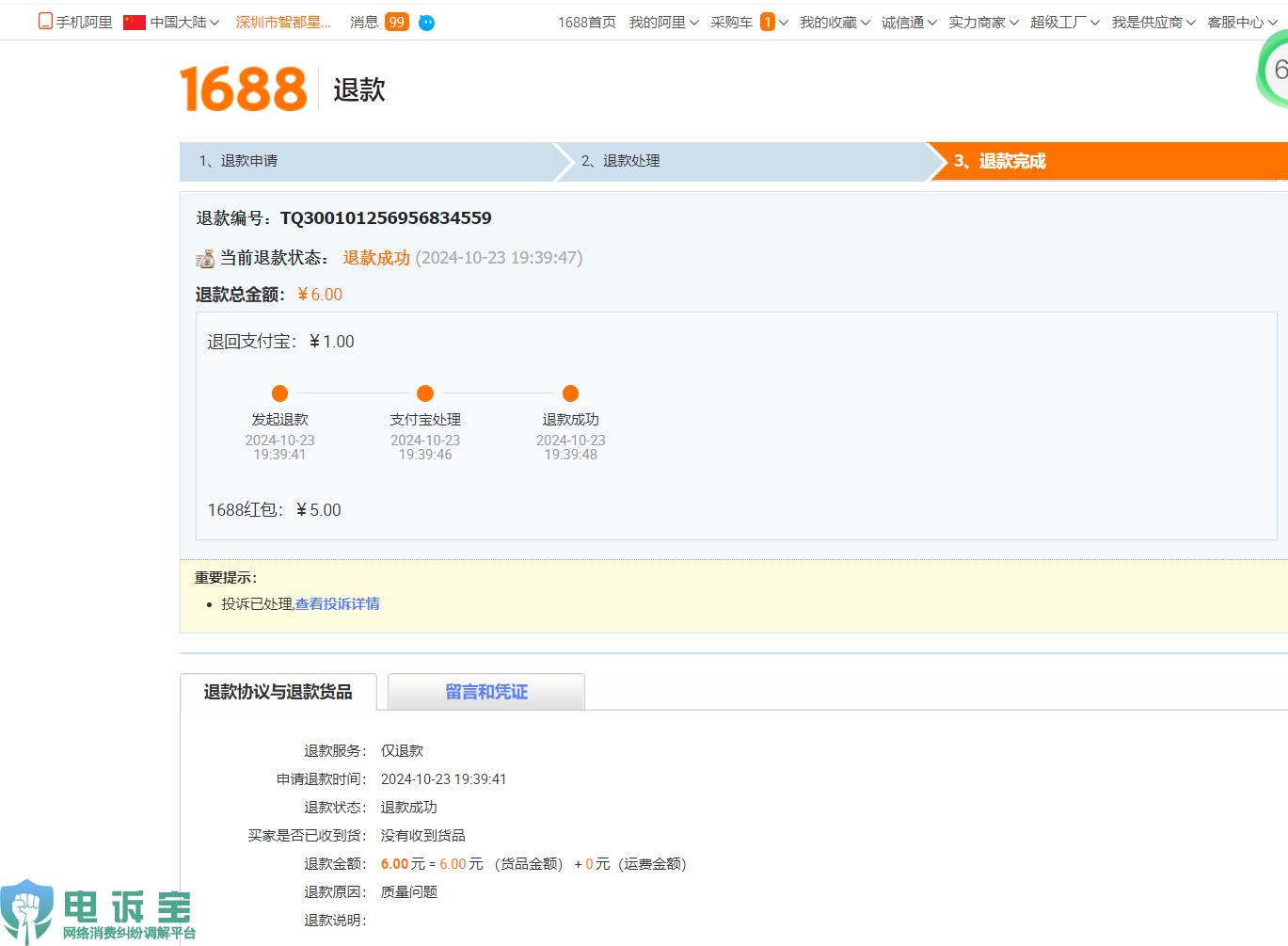 10月23日廣東的劉先生向“電訴寶”投訴,劉先生於2024年10月23日被1688平台判定了僅退款,平台沒經過商家核實任何情況就判定了僅退款,嚴重損壞了劉先生的合法權益,要求退貨退款。