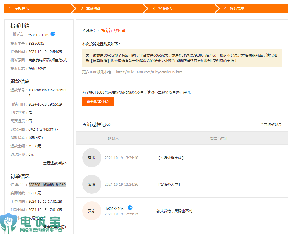 【案例三】用户投訴“1688”平台小二不合理退全款判定