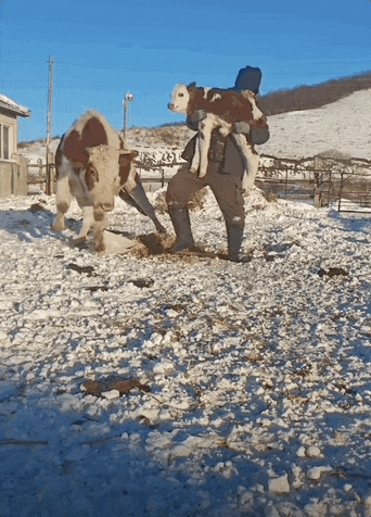 牧民朋友在母牛的死亡凝視下,扛起了剛出生的小牛犢~