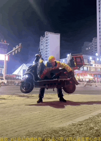 於是我們能看到外賣小哥費力舉起了電瓶車;