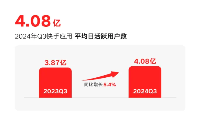 快手2024年第三季度的DAU為4.08億,環比增長3.29%,基本企穩,用户數據達到新高,可增速開始遲緩。拉長時間線,2023年一季度到今年三季度,快手DAU分別為3.74億、3.76億、3.87億、3.83億、3.94億、3.95億、4.08億,處於增長緩慢、逐漸見頂的狀態。