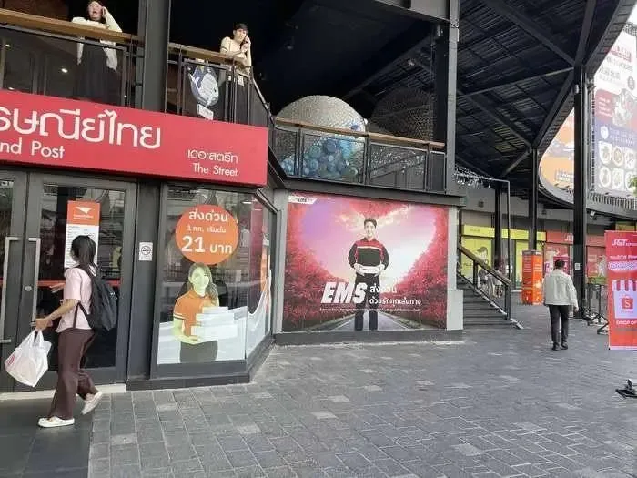 在The Street Ratchada Mall片區,一條只有幾百米長的街道上,就緊挨着六七家不同快遞公司的網點,各家的廣告海報也都使出渾身力氣佔據最顯眼的位置。