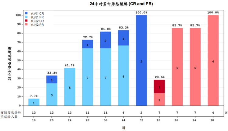 蛋白尿下降方面,隊列1在第36周時下降78.3%,隊列2在第24周時下降73.8%。隊列1在36周時蛋白尿緩解率達81.8%;隊列2在24周時蛋白尿緩解率則達85.7%。