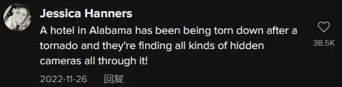 “一間阿拉巴馬的酒店因為龍捲風被拆除了,結果他們在酒店裏發現了各種各樣的偷拍鏡頭…”