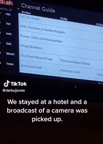這種情況下,Darby和朋友完全不敢入睡,索性就盯着電視看起了“廁所直播”。她們從晚上10點半一直看到凌晨4點半,但畫面並沒有出現任何變化,猜測該房間可能並沒有人入住。