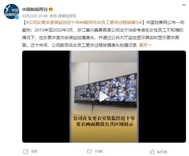 這也讓小編想到了最近國內的一則新聞。浙江一家公司“出於安全考慮”,在女性員工不知情的情況下,在女更衣室安裝攝像頭近10年,數百名女員工更衣過程被偷拍,並通過公共大廳監控顯示屏即時顯示。