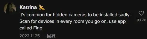 “不幸的是,安裝偷拍攝像頭很常見,你最好用一個軟件掃描一下你的整個房間,來查看是否有隱藏攝像頭。”