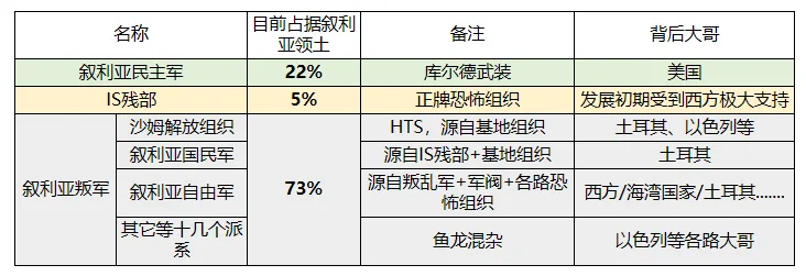 剩下的我們統稱為敍利亞叛軍,當然,現在巴沙爾政府已經投降了,成王敗寇,叛軍有可能轉正,但這後面非常複雜,隨後再説。
