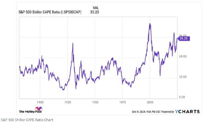 2. 12月4日,美股標普500的席勒市盈率達到了38.87,歷史第三高,是歷史平均值17.71的兩倍多。前兩次高點,第一次是1999年12月達到了44.19,後面2000年科網股泡沫崩潰。第一次是2022年1月達到39,後面美股指數跌了20%,不少股跌幅超過50%。這次又上了39,不少人擔心出問題。