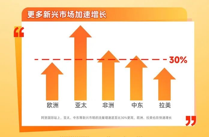 過去的11月,阿里國際站平台上,全球市場流量的平均增速達到30%,亞太、中東、非洲增速大大高於30%,而歐洲、拉美也接近30%。