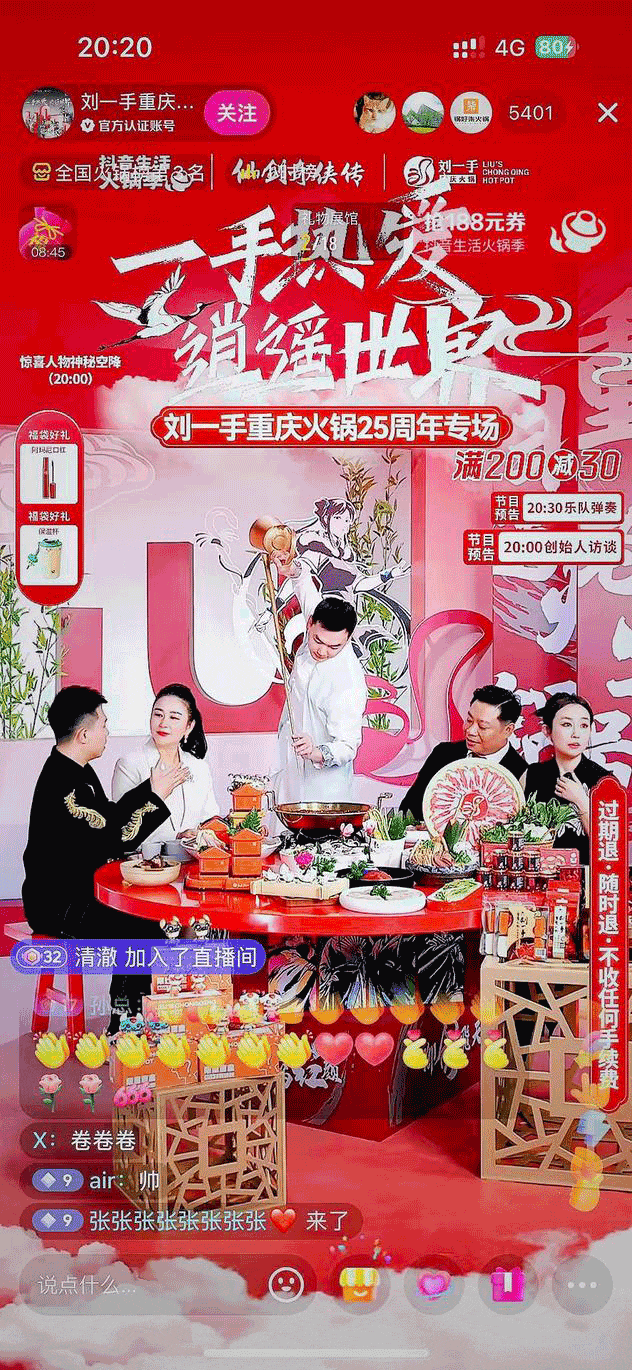值得一提的是,劉一手重慶火鍋在品牌節期間的直播,在場景打造上,融合了現代元素和仙俠風,視覺呈現很有質感;直播環節中,劉一手創始人梅姐與寬院子創始人喻總空降直播間為觀眾帶來很大驚喜,而且劉一手直播間還花式整活,將傳統樂器與現代音樂結合,帶給觀眾一場極具衝擊力的表演。