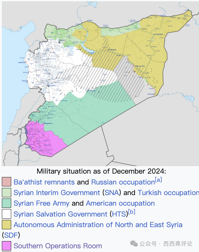 阿薩德倒台後,敍利亞內部仍然是分裂的。領土分別被五個勢力佔據。包括土耳其的傀儡SNA,美國支持的庫爾德人自治區(SDF)和自由敍利亞(SFA)軍,HTS,SOR。土耳其和庫爾德人矛盾很深,阿薩德倒台後,土耳其控制的SNA和庫爾德人SDF在敍利亞北部繼續激烈交火。HTS的野心可能也不僅僅是做敍利亞的一個地方軍閥。阿薩德的倒台,並不一定能夠結束敍利亞的內戰,相反有可能是新一輪內戰的開始。