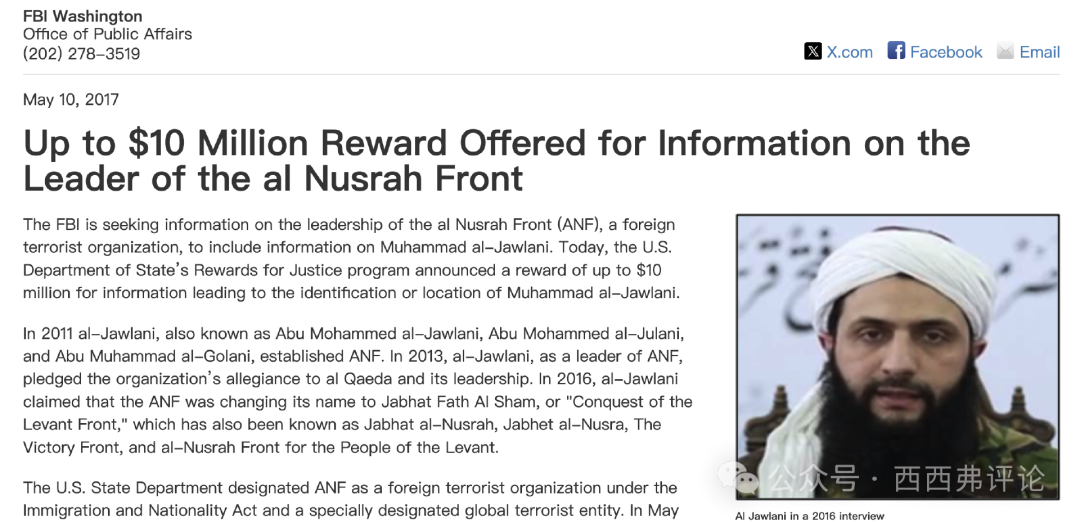 推翻阿薩德的主力,是沙姆解放組織(HTS)。這個組織在2017年,被美國認定為恐怖主義組織,其領導人賈瓦拉尼,也是這次推翻阿薩德的領導,被美國國務院懸賞1000萬美元。這個懸賞通告,至今仍然在美國政府網站上掛着。
