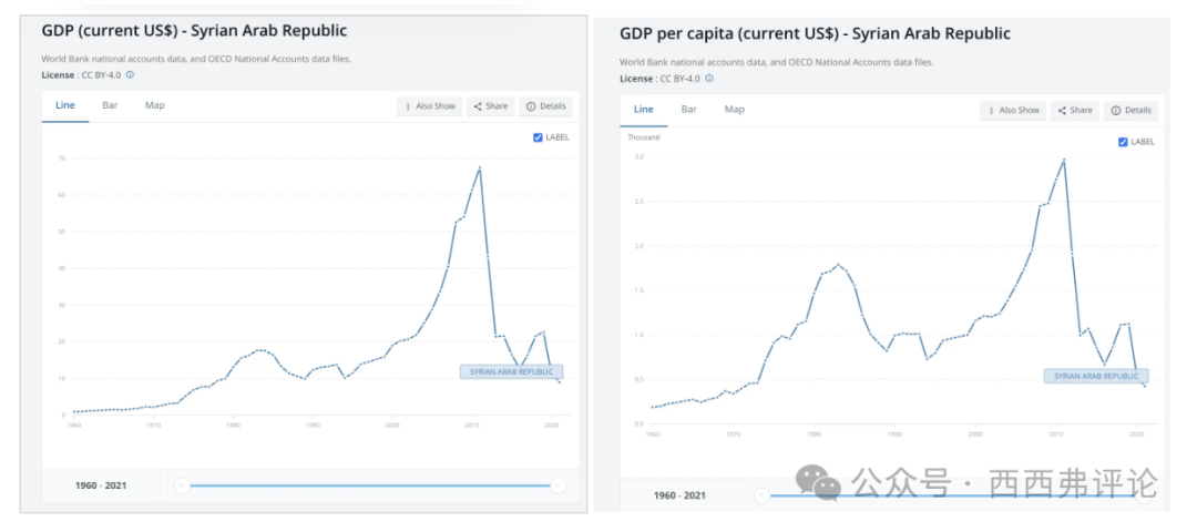 內戰爆發後,敍利亞的GDP在兩年之內,暴跌了接近70%。國家經濟徹底崩潰。2021年,敍利亞的GDP只有90億美元,是2011年的13%,人均GDP是421美元,是2011年的14%。人民生活水深火熱。