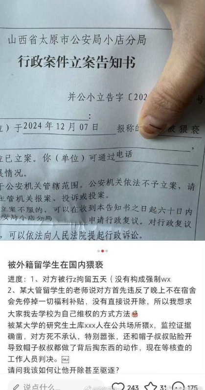 12月8日,有女生在社交媒體上發帖,稱在公共場所遭到山西大學一外國留學生猥褻。